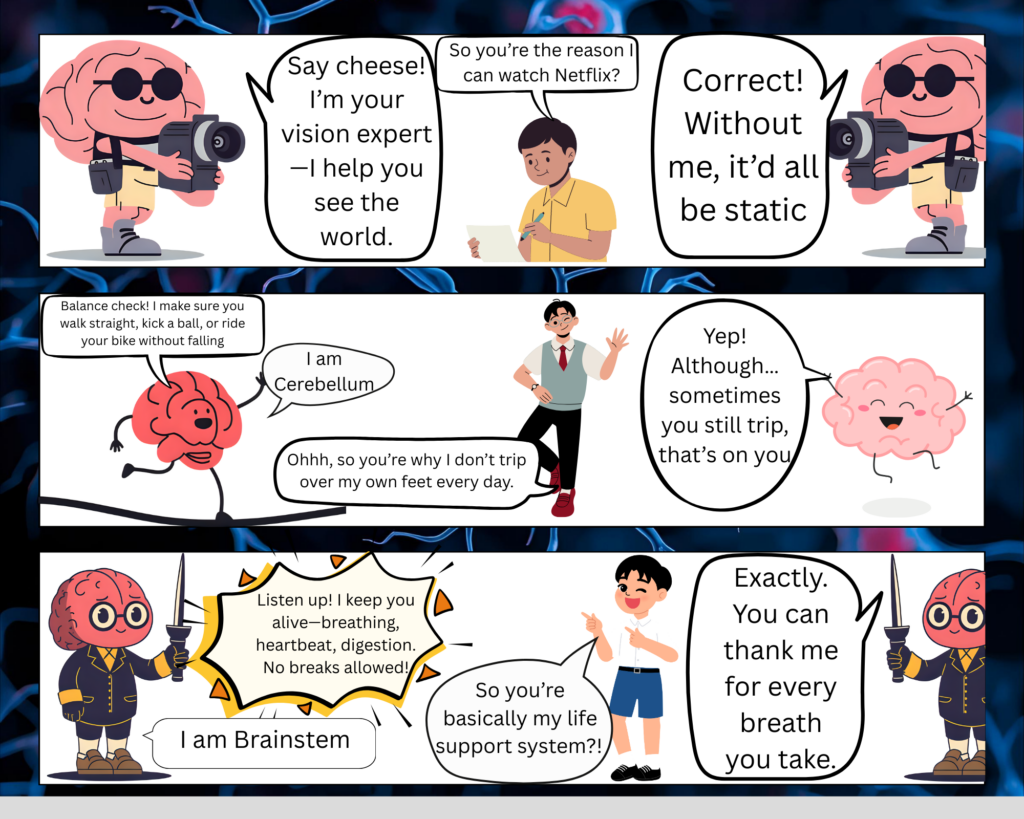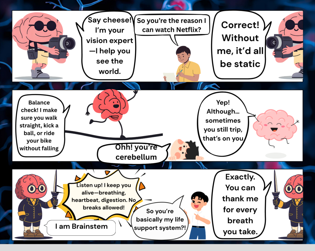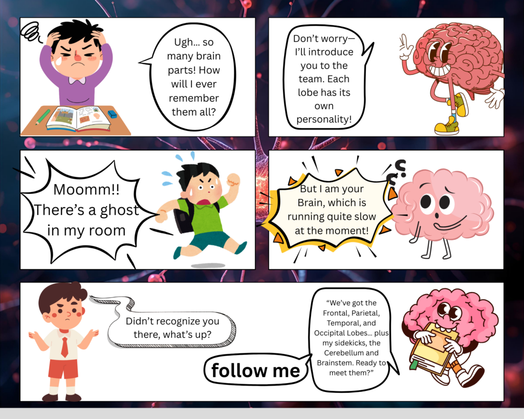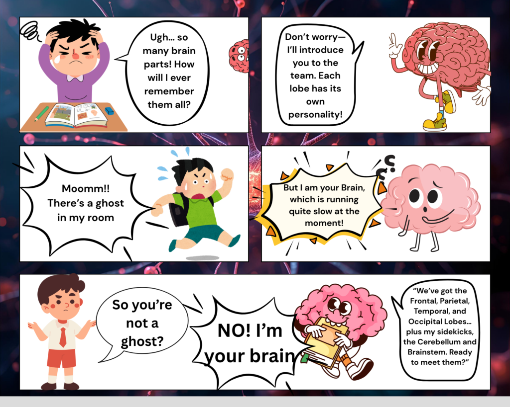 Typical Audience: University students, age ranging from 18-25, who are currently in high school and university students from psychology and biology who are learning the brain anatomy for the first time. In the extreme audience comes high school students who took basic neuroscience and adult learners who need simplified but very accurate explanations. This comic will also target the audience who uses digital learning tools and enjoys comic infographics. Students learning brain anatomy are often faced with information overload. The brain has many parts, each with technical names and functions, resulting in the result of memorizing them without context feels abstract. Learners need the resources that break down the technical information into manageable chunks by using simple analogies and showing clear visual connections between structure and function.