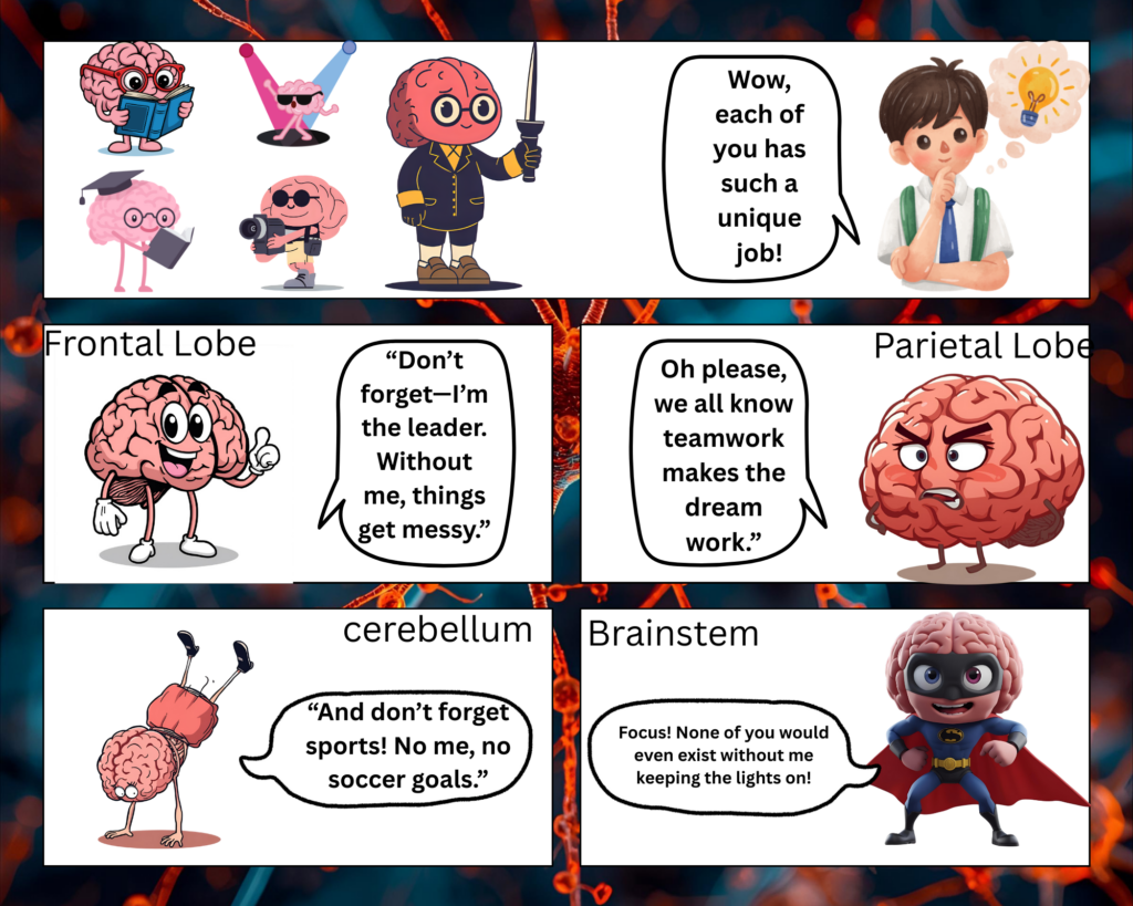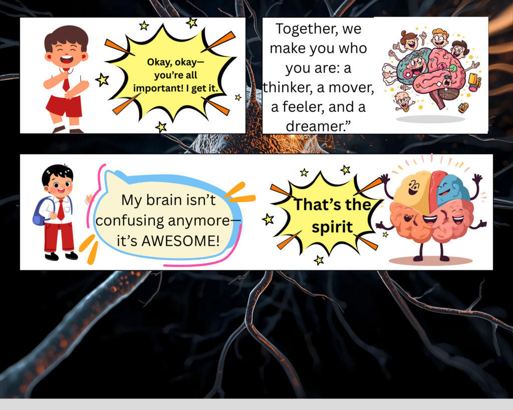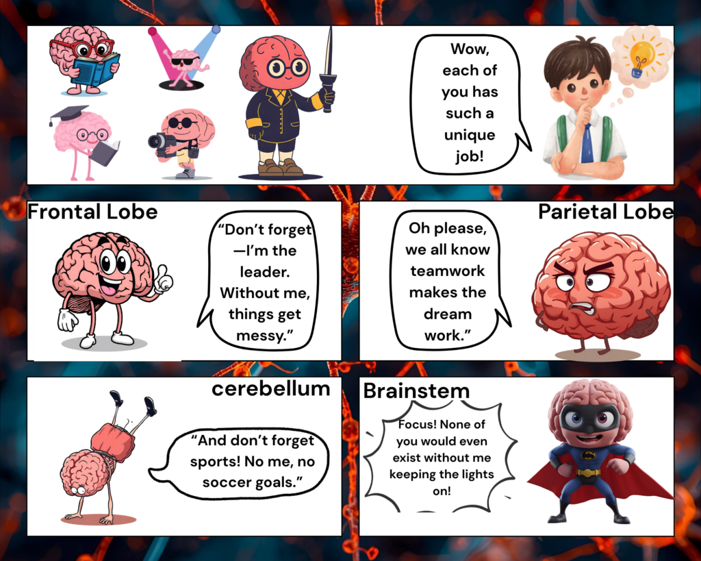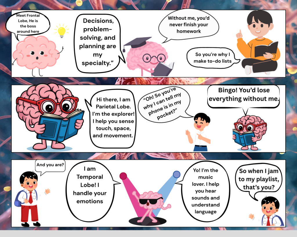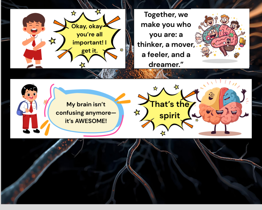 Typical Audience: University students, age ranging from 18-25, who are currently in high school and university students from psychology and biology who are learning the brain anatomy for the first time. In the extreme audience comes high school students who took basic neuroscience and adult learners who need simplified but very accurate explanations. This comic will also target the audience who uses digital learning tools and enjoys comic infographics. Students learning brain anatomy are often faced with information overload. The brain has many parts, each with technical names and functions, resulting in the result of memorizing them without context feels abstract. Learners need the resources that break down the technical information into manageable chunks by using simple analogies and showing clear visual connections between structure and function.