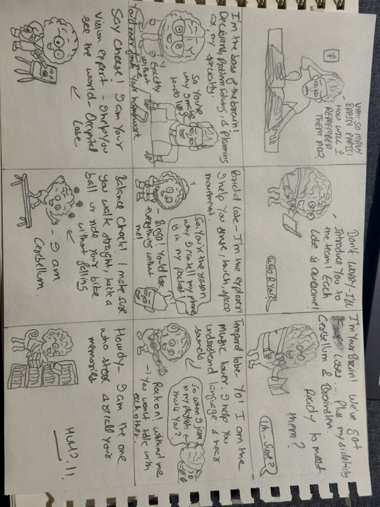 For revision, I started by adding a stronger and clearer introduction, setting up the premise of the frustrated student and the brain cartoon character stepping in as the teacher. It eliminated the initial confusion and made a strong base for a better transition into the later storyline. I also revisited my goals to focus on individual lobes and their everyday functions, making sure that they are aligned with my goals and content. These refinements aim to keep the comic learner-friendly while making sure that the design is aligned with educational purposes.